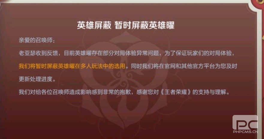 老亚瑟接到意见反馈,现阶段英雄曜存有一部分pk感受出现异常难题,为了更好地确保玩家们的pk感受,大家将临时屏蔽掉英雄曜在多的人游戏玩法中的采用。