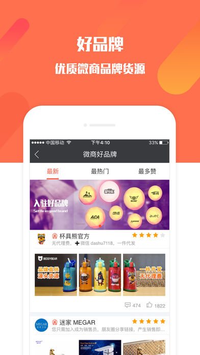 上一百多个微商知名品牌进驻,选择好知名品牌,迅速发展您的卖东西之行;