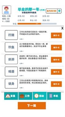 大学毕业的那一年是一款十分好玩儿的仿真模拟培养类游戏,游戏中玩家们将再度返回一个刚从高校中摆脱出去的青少年,刚触碰社会发展也有许多不了解的地区,这儿能够使你掌握许多专业知识哦,对这个游戏有兴趣爱好的玩家们,能够来免费下载试一下哦。