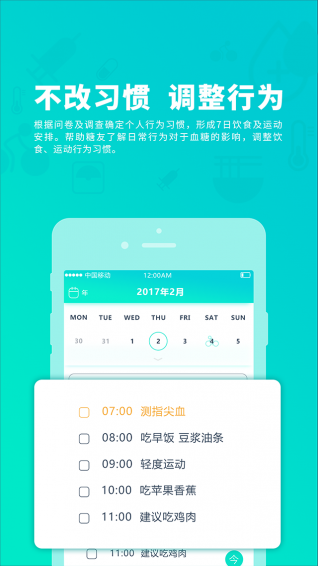 根据个人行为习惯填写问卷,形成7天饮食和运动项目。帮助糖友了解日常行为对血糖的影响,调整饮食和运动习惯;