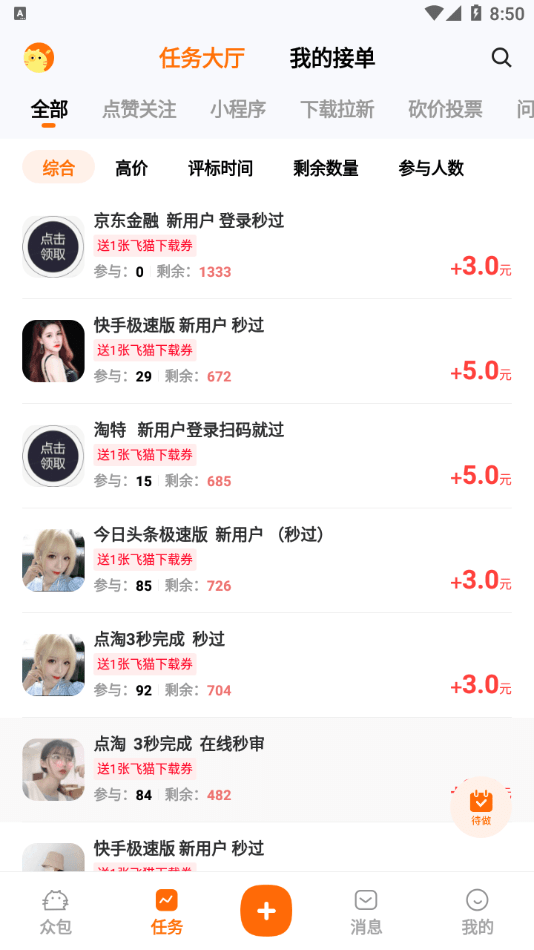 这是一个简单易用的通过做任务赚钱的平台。很多用户可能会选择通过在线接单赚钱。虽然钱不多,但相对方便。该软件的所有任务都没有阈值。用户可以选择合适的任务,互相帮助,轻松赚钱。