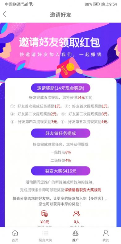 2.邀请好友享受14元现金奖励,永久一级好友8%,二级好友4%。还有更多裂变奖红包等着你。
