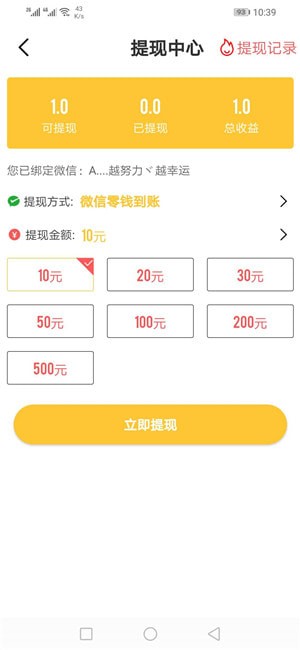 3、收益满10元可提现,支持提现在微信钱包上,提现24小时内到账。