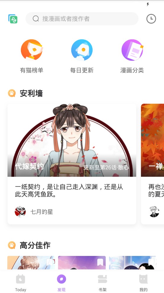 2、有猫漫画内简洁的设计ui给游戏玩家一个自然环境干净整洁的文章阅读自然环境;