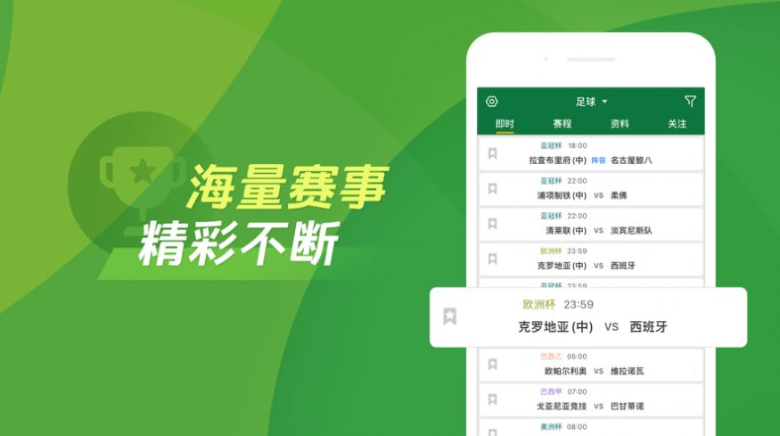 即时赛况:查询足球队/篮球赛比赛的即时赛况,根据APP给予的动画直播、比赛过程等作用,让客户時刻把握比赛彼此的攻防情况,由于完美无瑕查询比赛赛况的客户,APP的关心作用可协助客户即时接受比赛的逐渐、上半场、完场、入球等重要情况通告;