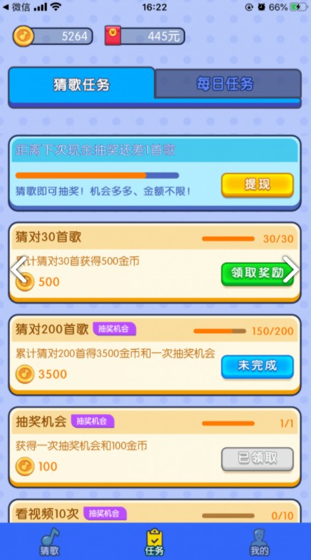 急速猜歌红包版游戏是一款好玩儿的益智游戏,游戏有着十分多悦耳的歌曲,及其各种各样的游戏玩法方式,充分发挥自身的累积,进行大量的猜歌挑戰,获得大量的游戏奖赏,还能够换取各种各样的大红包奖赏,体会大量的游戏快乐。